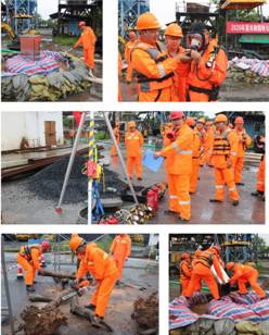 根據(jù)公司防汛演練計劃,本次演練共分市政照明設施搶險、道路綠化清障、有限空間應急救援、道路內澇強排等4個搶險小分隊。演練前,由總指揮周鵬作動員講話,向應急隊伍介紹了此次演練的目的、背景,并下達演習命令。應急隊伍接到演習命令后,陸續(xù)模擬了城市基礎設施防汛時可能發(fā)生的各種突發(fā)情況。一是熟練使用油鋸、高空剪等設備,對受洪水影響的倒伏的樹木進行清理,保障城市道路通暢;二是對有限空間作業(yè)救援中的管道有害氣體檢測、管道通風系統(tǒng)建立、救援起重三腳架搭建等項目進行演練,要求搶險人員熟悉救援裝備和有限空間救援步驟,并正確使用正壓式空氣呼吸器;三是對易受洪水威脅的配電設施搭建臨時圍堰,并采用非接觸驗電棒檢測受淹區(qū)域是否存在危機搶險人員的漏電情況;四是模擬照明電力設施被洪水圍困,應急隊伍在保證安全的前提下,對即將淹沒的配電設備進行斷電、搬離。演練完畢后,由現(xiàn)場總指揮就本次演練進行了點評,指出了此次演練中發(fā)現(xiàn)的部分隊員存在安全意識不夠強,設備使用不夠熟練等情況,認為還需加大應急搶險技能培訓力度,提高隊員面對緊急突發(fā)狀況反應能力。
