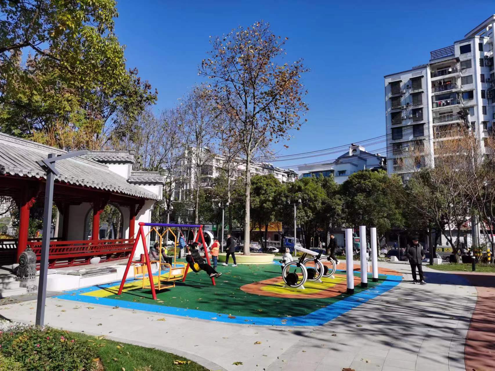 公園內(nèi)布置有健身活動區(qū)及兒童游樂區(qū),新增了太陽能健身器材、無動力單車、 七彩秋千、七彩蹺蹺板,修繕一新的景觀閑亭和長廊為周圍居民提供休憩場地。園區(qū)內(nèi)還增設(shè)了智慧座椅和全市第一個裝配式智慧公廁,在打造智慧公園的同時,為市民提供了直飲水、公廁、休憩空間等便民服務(wù)。夜間采用感應(yīng)花瓣燈、報樹燈、飄影燈、投影燈、草坪燈、霧森等燈光效果,對園路、擋墻進(jìn)行亮化布置,打造了游園夜間獨特景觀效果;綠化景觀以藍(lán)色“無盡夏”繡球花為主基調(diào),增加花境布置,在每年6-9月可呈現(xiàn)出一座美麗花園。