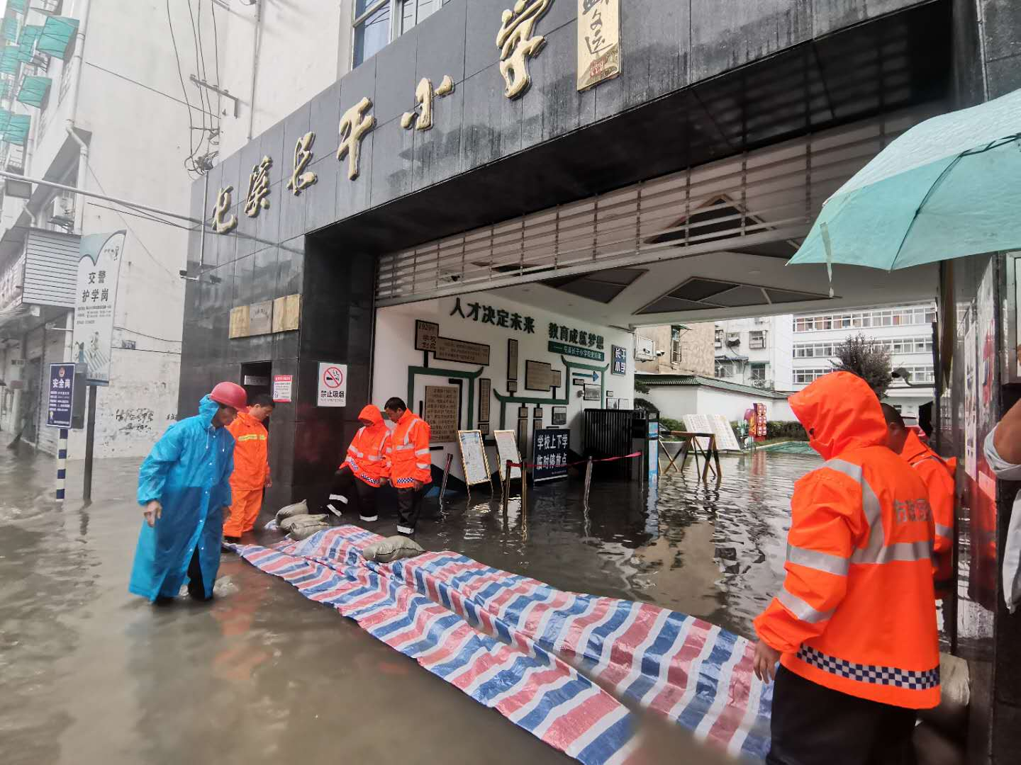 7月7日下午,受強降雨天氣影響,中心城區(qū)市政設(shè)施排水不暢,長干小學及周邊路段出現(xiàn)大面積積水情況,校園內(nèi)發(fā)生內(nèi)澇,積水嚴重。市政園林公司接到險情后,立即組織人員15名、車輛4臺、應(yīng)急設(shè)施2臺、沙袋100個等防汛物資,趕赴現(xiàn)場開展防汛搶險工作。
