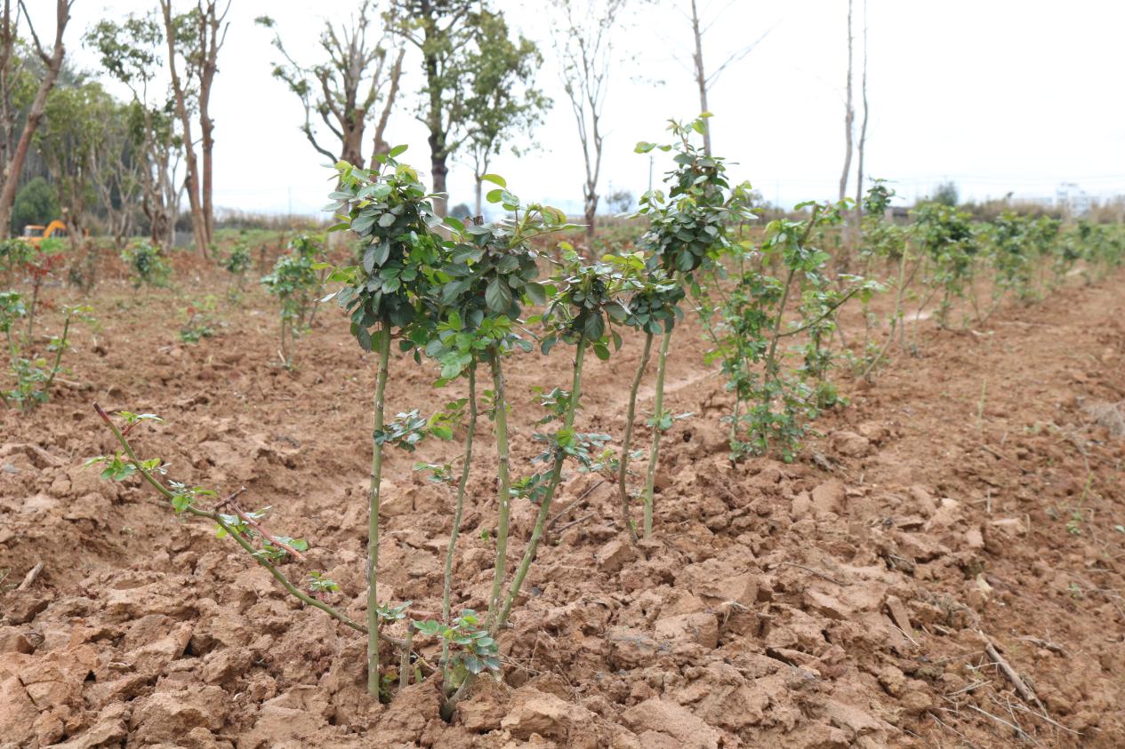 在月季扦插大棚內(nèi),工作人員正在揮舞鋤頭進行松土,前期扦插的一株株月季已經(jīng)抽出了新芽,安吉拉、大游行等品種的月季長勢喜人;藤本月季花墻前,工作人員正在對月季的生長情況進行記錄,檢查月季是否存在病蟲害;種植地上,挖掘機正在對場地進行平整,為苗圃擴大種植規(guī)模做好準(zhǔn)備。
