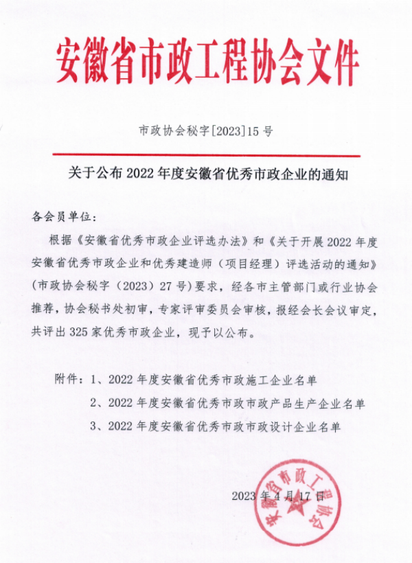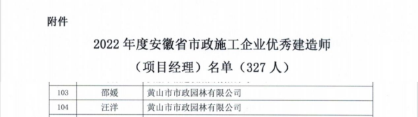 近日,市政園林公司榮膺2022年度安徽省優(yōu)秀市政施工企業(yè),2022年度黃山市建筑業(yè)“優(yōu)秀成長(zhǎng)型”企業(yè),兩名項(xiàng)目經(jīng)理獲評(píng)2022年度安徽省市政施工企業(yè)優(yōu)秀建造師。
