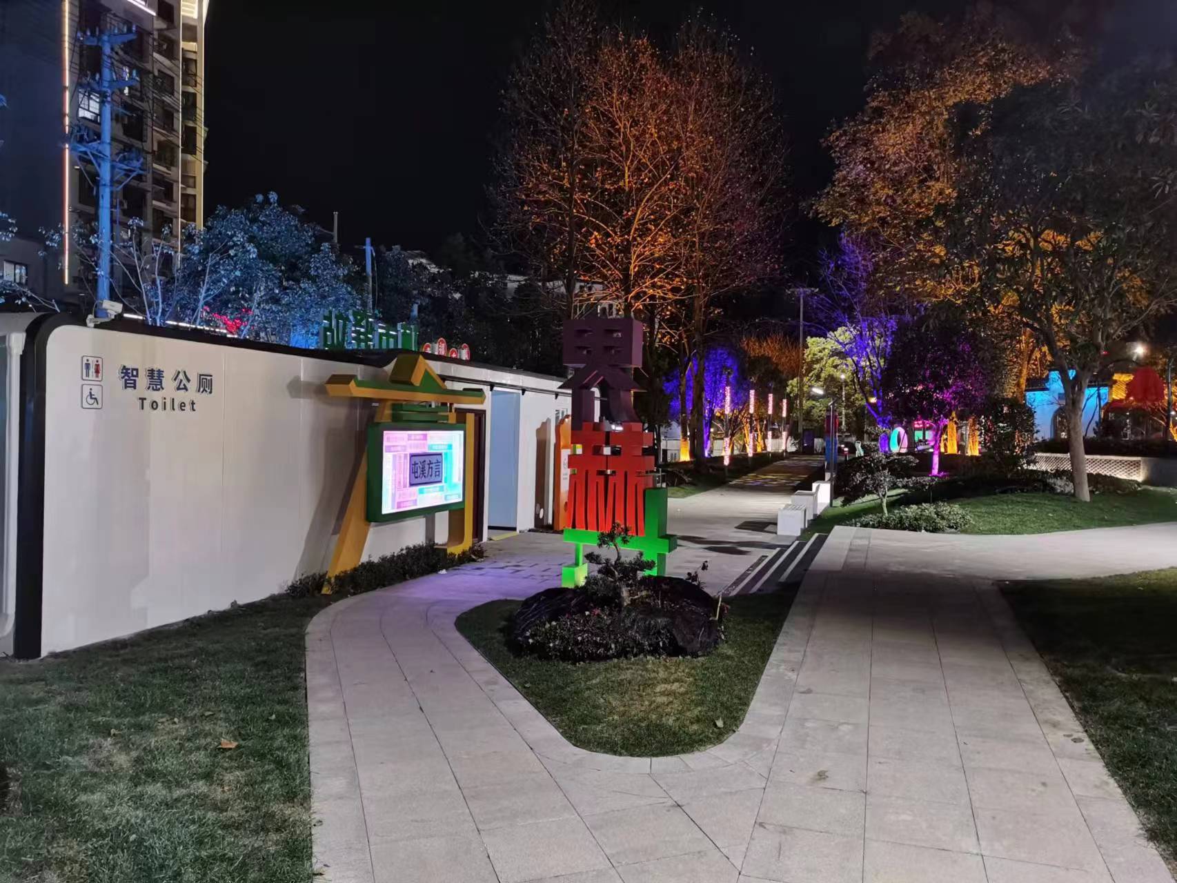 公園內(nèi)布置有健身活動區(qū)及兒童游樂區(qū),新增了太陽能健身器材、無動力單車、 七彩秋千、七彩蹺蹺板,修繕一新的景觀閑亭和長廊為周圍居民提供休憩場地。園區(qū)內(nèi)還增設(shè)了智慧座椅和全市第一個裝配式智慧公廁,在打造智慧公園的同時,為市民提供了直飲水、公廁、休憩空間等便民服務(wù)。夜間采用感應(yīng)花瓣燈、報樹燈、飄影燈、投影燈、草坪燈、霧森等燈光效果,對園路、擋墻進(jìn)行亮化布置,打造了游園夜間獨特景觀效果;綠化景觀以藍(lán)色“無盡夏”繡球花為主基調(diào),增加花境布置,在每年6-9月可呈現(xiàn)出一座美麗花園。